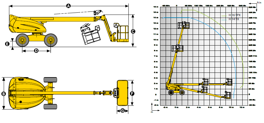 בבמת 16 מטר מדגם TPX, טווח ההגעה של הטלסקופ הוא מעל 12 מטרים, מה שמאפשר גישה גם לסביבת עבודה המרוחקת מאד מנקודת המוצא של הבמה, בין בגובה ובין לעומק.